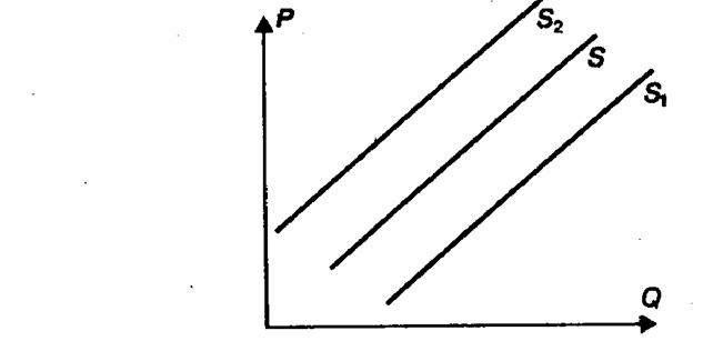 Рис. 6.4. Влияние неценовых факторов на предложение: S — первоначальное предложение: S1 — возросшее предложение; S2 — уменьшившееся предложение