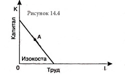 Линия изокосты представленная на рисунке 14.4 показывает набор комбинаций экономических ресурсов (в данном случае труда и капитала), которые фирма может приобрести с учетом рыночных цен на ресурсы и при полном использовании своего бюджета.