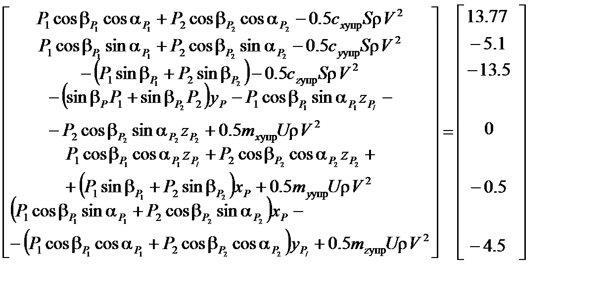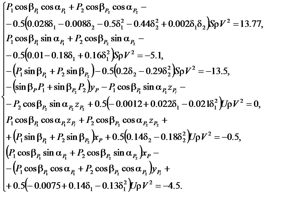 Вектор управляющих сил и моментов можно разделить на создаваемый аэродинамическими управляющими поверхностями и определяемый движителями дирижабля. В этом случае система уравнений, определяющая положение управляющих элементов в желаемом состоянии дирижабля, равна: