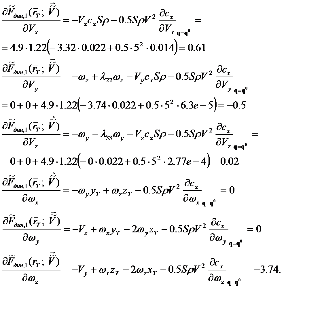 Теперь приступим непосредственно к линеаризации уравнений дирижабля. Вычислим частные производные от правых частей (2.120) по переменным состояния в точке (2.159), (2.162). В результате получим выражения, аналогичные равенствам (2.131) – (2.133).