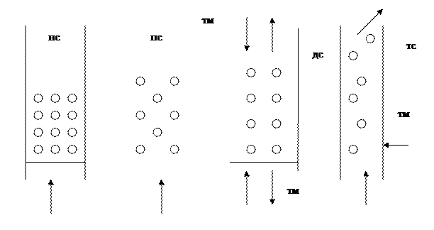 С точки зрения характера перемещения дисперсной системы в технологическом аппарате различают основные разновидности: неподвижный слой (НС), псевдоожиженный слой (ПС), движущийся слой (ДС) и транспортные системы (ТС).