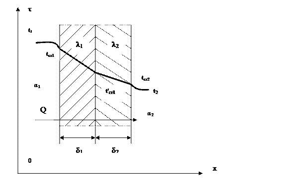 Рассмотрим передачу теплоты сквозь многослойную плоскую стенку от горячего теплоносителя к холодному