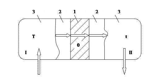 Под теплопередачей понимают теплоперенос теплоты через теплопередающую поверхность (нормально к ней); для схемы это три стадии: перенос теплоты через пограничные пленки и через стенку.