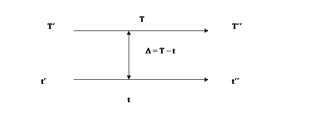 · перенос между потоками теплоносителей (нормально к их движению); он возникает при наличии температурного напора Δ = Т – t