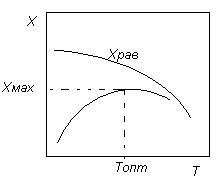 Х-Т диаграмма: Для обратимых экзотермических процессов с повышением температуры снижается равновесный выход продуктов. Так как несмотря на повышение скорости прямой реакции, выход ограничивается равновесием, а при дальнейшем повышении температуры равновесие сдвигается влево (интенсивно идет обратная реакция). То есть необходимо подбирать для каждого конкретного случая оптимальную температуру. Так как одним из основных показателей процесса является выход продукта.