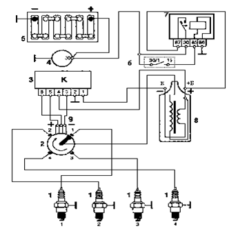 2) подача напряжения зажигания на свечи в определённом порядке (1-3-4-2);