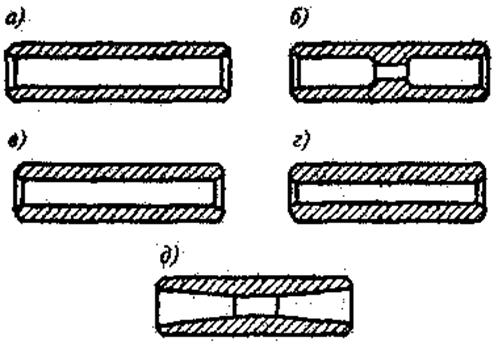 а) палец с цилиндрическим отверстием и относительно тонкими стенками, б) палец с увеличенной жесткостью в среднем сечении, в) короткий палец с толстыми стенками, г) палец для дизелей с толстыми стенками, д) палец «равного сопротивления изгибу»