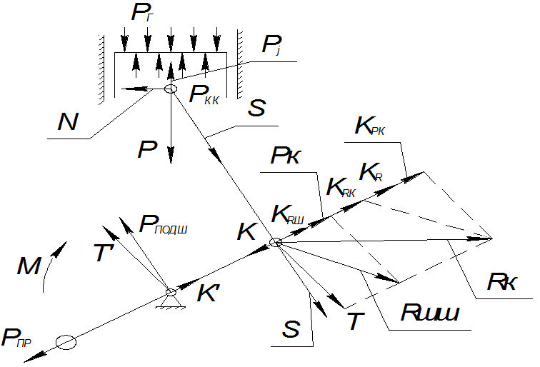 Сила, действующая на подшипник коренной шейки - PПОДШ, представляет собой векторную сумму сил реакции опоры Т/ и К/ .
