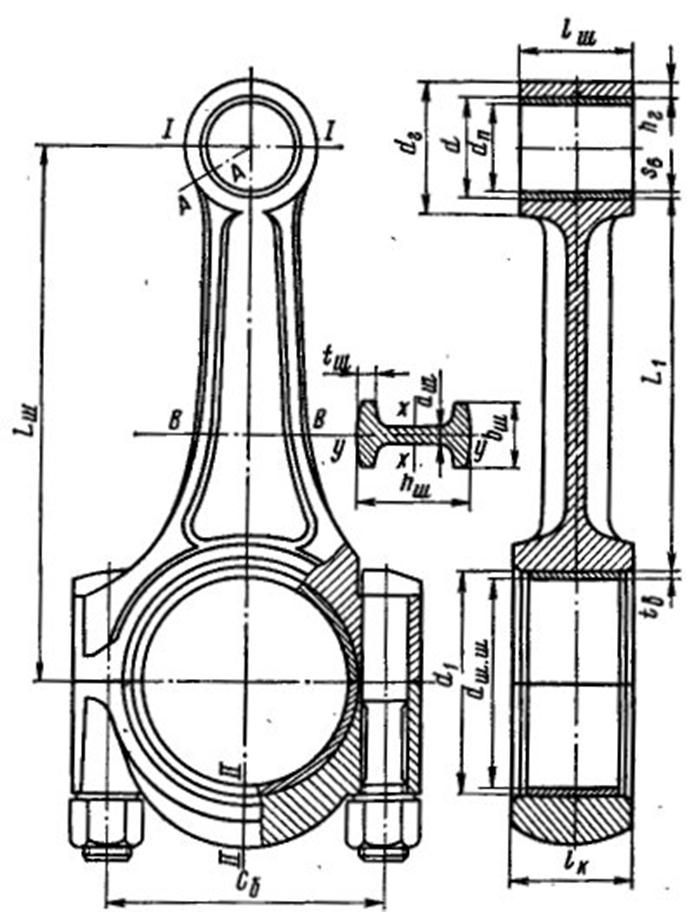Сечение стержня шатуна: двутавр, круглое, Н-образное, прямоугольное и др.