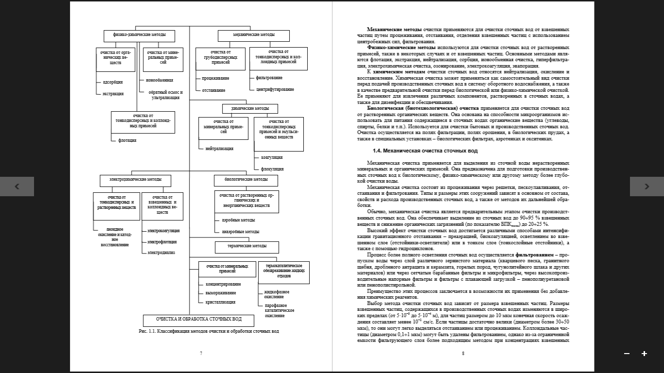 Механические методы очистки применяются для очистки сточных вод от взвешенных частиц путем процеживания, отстаивания, отделения взвешенных частиц с использованием центробежных сил, фильтрования. Физико-химические методы используются для очистки сточных вод от растворенных примесей, также в некоторых случаях и от взвешенных частиц. Основными методами являются флотация, экстракция, нейтрализация, сорбция, ионообменная очистка, гиперфильтрация, электрохимическая очистка, озонирование, электрокоагуляция, эвапорация. К химическим методам очистки сточных вод относятся нейтрализация, окисление и восстановление. Химическая очистка может применяться как самостоятельный вид очистки перед подачей производственных сточных вод в систему оборотного водоснабжения, а также в качестве предварительной очистки перед биологической или физико-химической очисткой. Ее применяют для извлечения различных компонентов, растворенных в сточных водах, а также для дизенфекции и обесцвечивания. Биологическая (биотехнологическая) очистка применяется для очистки сточных вод от растворенных органических веществ. Она основана на способности микроорганизмов использовать для питания содержащиеся в сточных водах органические вещества (углеводы, спирты, белки и т.п.). Используется для очистки бытовых и производственных сточных вод. Очистка осуществляется на полях фильтрации, полях орошения, в биологических прудах, а также в специальных установках – биологических фильтрах, аэротенках и окситенках.