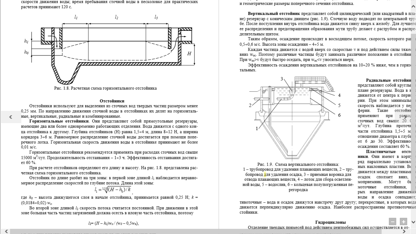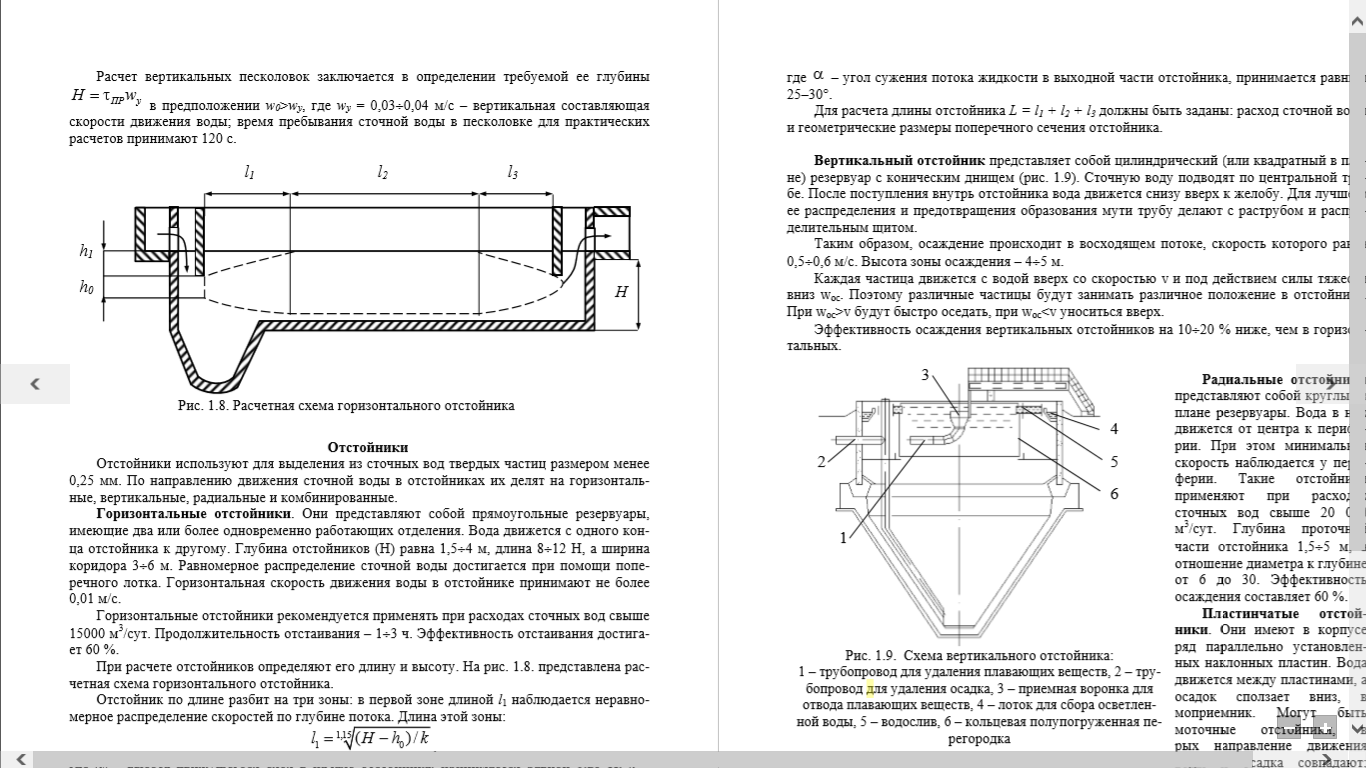 где α – угол сужения потока жидкости в выходной части отстойника, принимается равным 25–30°. Для расчета длины отстойника L = l1 + l2 + l3 должны быть заданы: расход сточной воды и геометрические размеры поперечного сечения отстойника.