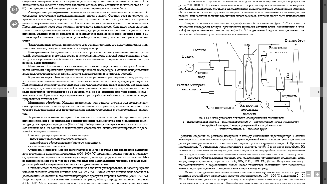 Термоокислительные методы. В термоокислительных методах обезвреживания органические примеси в сточных водах окисляются кислородом воздуха при повышенной температуре до безвредных продуктов (H2О, СО2). Выбор метода обезвреживания зависит от объема сточных вод, их состава и теплотворной способности, экономичности процесса и требований к очищенным стокам. Наиболее распространенные из этих методов: - парофазное окисление («огневой метод»); - жидкофазное обезвреживание («мокрое сжигание»); - каталитическое окисление. Сущность «огневого» метода заключается в том, что сточная вода, вводимая в распыленном состоянии в высокотемпературные (900÷1000 °С) продукты горения топлива, испаряется, органические примеси в сточной воде сгорают, образуя продукты полного сгорания. Минеральные примеси образ уют при этом твердые или расплавленные частицы, которые выводятся из рабочей камеры печи или уносятся с дымовыми газами. Огневой метод обезвреживания сточных вод является универсальным и характеризуется высокой степенью очистки сточных вод (98÷99,9 %). В этом методе сточная вода вводится в распыленном состоянии в высокотемпературные продукты сгорания топлива (900÷1000 °С). Вода испаряется, а органические примеси сгорают, образуя продукты полного сгорания (СО2, Н2О). Минеральные примеси при этом образуют твердые или расплавленные частицы, которые удаляются из камеры печи. Недостатком метода является высокий расход топлива на испарение воды и перегрев пара до 900÷1000 °С. В связи с этим огневой метод рекомендуется использовать: во-первых, при большом количестве сточных вод, содержащих высокотоксичные органические примеси, обезвреживание которых другими методами невозможно или экономически невыгодно; во-вторых, при наличии горючих вторичных энергоресурсов, которые могут быть использованы вместо топлива. Сущность термоокислительного жидкофазного обезвреживания (рис. 1.61) состоит в окислении кислородом воздуха органических примесей сточной воды, находящихся в жидкой фазе при повышенных температуре (до 350 ºС) и давлении. Недостатком циклонных печей является большой унос солевой массы потоком газ.