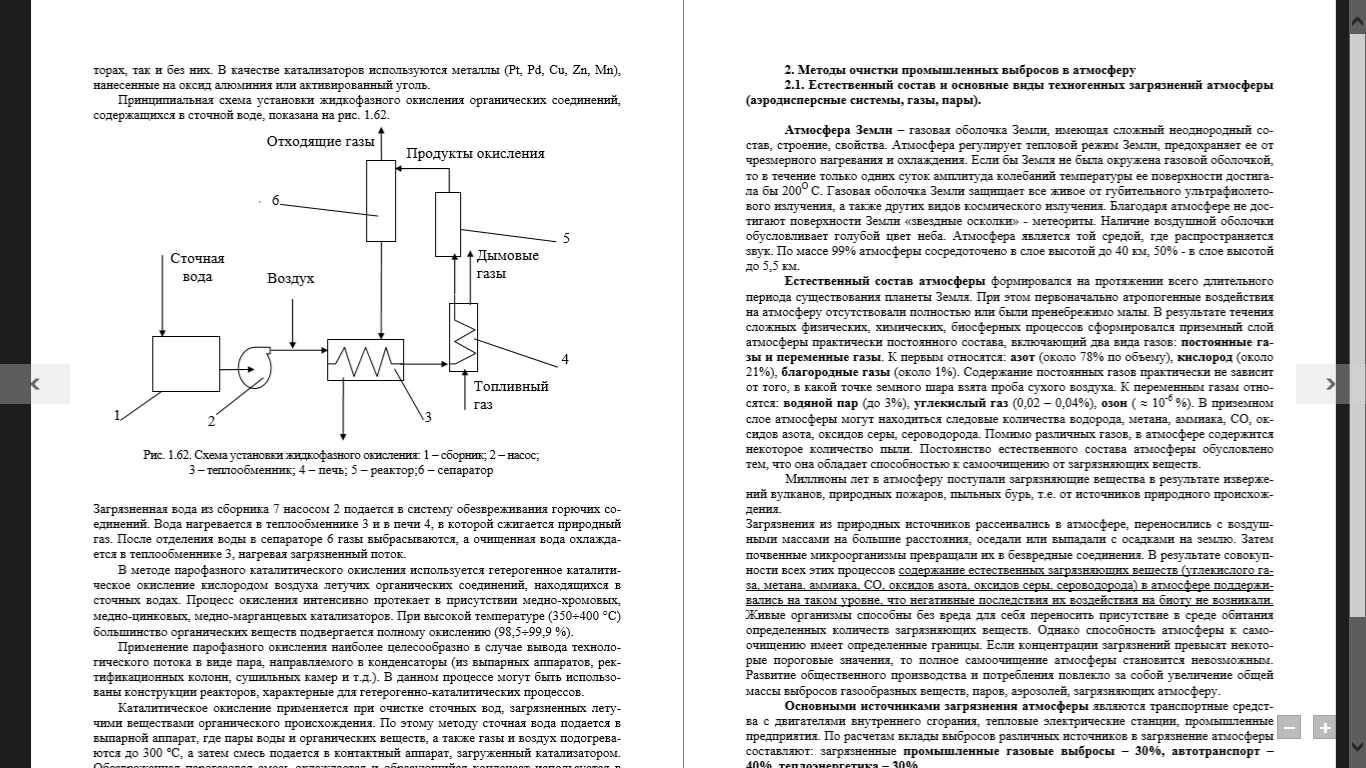 Загрязненная вода из сборника 7 насосом 2 подается в систему обезвреживания горючих соединений. Вода нагревается в теплообменнике 3 и в печи 4, в которой сжигается природный газ. После отделения воды в сепараторе 6 газы выбрасываются, а очищенная вода охлаждается в теплообменнике 3, нагревая загрязненный поток. В методе парофазного каталитического окисления используется гетерогенное каталитическое окисление кислородом воздуха летучих органических соединений, находящихся в сточных водах. Процесс окисления интенсивно протекает в присутствии медно-хромовых, медно-цинковых, медно-марганцевых катализаторов. При высокой температуре (350÷400 °С) большинство органических веществ подвергается полному окислению (98,5÷99,9 %). Применение парофазного окисления наиболее целесообразно в случае вывода технологического потока в виде пара, направляемого в конденсаторы (из выпарных аппаратов, ректификационных колонн, сушильных камер и т.д.). В данном процессе могут быть использованы конструкции реакторов, характерные для гетерогенно-каталитических процессов. Каталитическое окисление применяется при очистке сточных вод, загрязненных летучими веществами органического происхождения. По этому методу сточная вода подается в выпарной аппарат, где пары воды и органических веществ, а также газы и воздух подогреваются до 300 ºС, а затем смесь подается в контактный аппарат, загруженный катализатором. Обезвреженная парогазовая смесь охлаждается и образующийся конденсат используется в производстве. Термоокислительные методы очистки применяются при небольших расходах сточных вод с высокой концентрацией загрязнений.