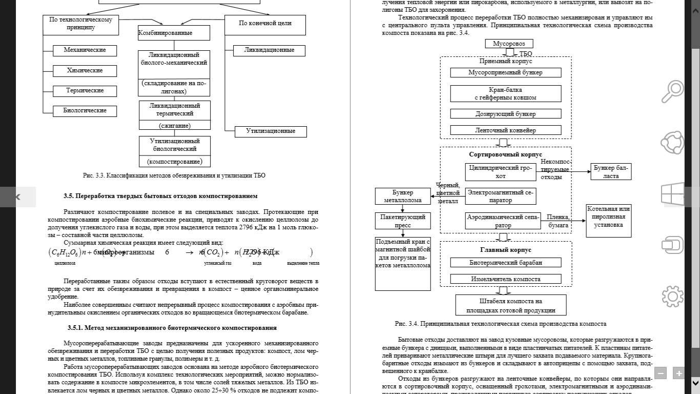 Мусороперерабатывающие заводы предназначены для ускоренного механизированного обезвреживания и переработки ТБО с целью получения полезных продуктов: компост, лом черных и цветных металлов, топливные гранулы, полимеры и т. д. Работа мусороперерабатывающих заводов основана на методе аэробного биотермического компостирования ТБО. Используя комплекс технологических мероприятий, можно нормализовать содержание в компосте микроэлементов, в том числе солей тяжелых металлов. Из ТБО извлекается лом черных и цветных металлов. Однако около 25÷30 % отходов не подлежит компостированию. Эти материалы сжигают на компостных заводах или подвергают пиролизу для получения тепловой энергии или пирокарбона, используемого в металлургии, или вывозят на полигоны ТБО для захоронения. Технологический процесс переработки ТБО полностью механизирован и управляют им с центрального пульта управления. Принципиальная технологическая схема производства компоста показана на рис. 3.4.