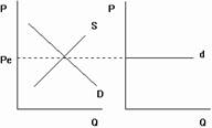 В силу однородности продукции и наличия большого количества совершенных заменителей, ни одна фирма не м-ет продавать свой Т по цене, хоть немного превышающей цену равновесия, Ре. С другой стороны, отдельная фирма очень мала по сравнению с совокупным рынком, и она м-ет продать всю свою продукцию по цене Ре, т.е. у нее нет необходимости продавать Т по цене ниже Ре. Т.о., все фирмы продают свою продукцию по рыночной цене Ре, определяемой рыночным спросом и предлож-ем. Д-д фирмы — совершенного конкурента Горизонтальная кривая спроса на продукцию отдельной фирмы и единая рыночная цена (Ре=const) предопределяют форму кривых д-да в условиях соверш. конкуренции. 1. Совок-й д-д (