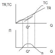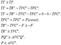 Докажем справедливость данных рассуждений. По определению, п=ТR-ТС. Если фирма максимизирует свою Р, производя n-ое кол-во изделий, то эта Р (пn) должна быть > или равна Р фирмы в условиях закрытия п/п (по), ибо в противном случае предприниматель сразу закроет свое п/п. Другими словами,