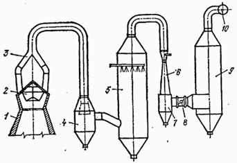Периодически пыль удаляется из бункера пылеуловителя в железнодорожный вагон через устройство, состоящее из отсечного клапана, шнекового транспортера и системы подачи воды или пара для увлажнения пыли. В полом скруббере 5 газ охлаждается и очищается от крупной пыли.