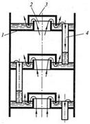 В колоннах с колпачковыми тарелками находятся тарелки 1 с патрубками 2, закрытые сверху колпачками 3 (число колпачков на тарелке определяется ее конструкцией). Нижние края колпачков снабжены зубцами или прорезями в виде узких вертикальных щелей. Жидкость перетекает с тарелки на тарелку через переливные трубы 4. Уровень жидкости на тарелке соответствует высоте, на которую верхние концы переливных труб выступают над тарелкой. Чтобы жидкость перетекала только по переливным трубам, а не через патрубки 2, верхние концы патрубков должны быть выше уровня жидкости. Нижние края колпачков погружены в жидкость так, чтобы уровень жидкости был выше верха прорезей.