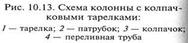 Колонны с колпачковыми тарелками (рис. 10.13). В колпачковых тарелках газ барботирует через жидкость, выходя из прорезей колпачков, расположенных на каждой тарелке. В прорезях газ дробится на мелкие струйки, которые по выходе из прорези поднимаются вверх и, проходя через слой жидкости на тарелке, сливаются друг с другом.