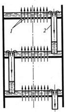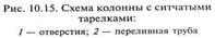 Колонны с ситчатыми тарелками (рис. 10.15). Ситчатые тарелки имеют отверстия 1 диаметром 2... 5 мм. Газ проходит через отверстия и барботирует слой жидкости на тарелке. При нормальной работе колонны жидкость не протекает через отверстия, так как она поддерживается снизу давлением газа. Высота слоя жидкости на тарелке составляет 25... 30 мм и определяется положением верхних концов переливных труб 2.