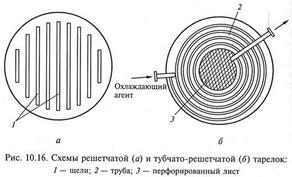 Трубчато-решетчатые тарелки являются разновидностью решетчатых тарелок. Решетку образует труба 2, изогнутая в плоскую спираль (рис. 10.16, б). По трубам пропускают охлаждающий агент для отвода теплоты, выделяющейся при абсорбции. Не занятую трубами площадь тарелки перекрывают перфорированным листом 3, живое сечение которого близко к живому сечению решетчатой части тарелки.