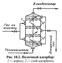 На рис. 18.2 показан полочный адсорбер, производительность которого может достигать 100000 м3/ч. В отличие от вертикального такой адсорбер лучше использует адсорбент при меньших значениях гидравлического сопротивления. Существенный недостаток промышленных адсорберов с неподвижным слоем адсорбента — относительно невысокая производительность, повышенная металлоемкость и громоздкость аппаратуры. Это является следствием низкой линейной скорости движения потока газа в сечении адсорбера (0,25—0,35 м/с). Имеются и другие недостатки: неравномерность адсорбции и десорбции, что обусловливает снижение коэффициента использования адсорбента; увеличение времени десорбции и энергозатрат; трудности автоматизации процесса. Эти недочеты можно исключить при проведении адсорбции непрерывно, во взвешенном слое адсорбента; пропускная способность адсорбера обеспечивается более высокими значениями линейной скорости в сечении (до 1,5—2,0 м/с). Принципиально конструкции таких адсорберов близки к барботажным тарельчатым абсорберам (с учетом применения твердой фазы). Для непрерывно действующего адсорбера характерна компоновочная схема, предусматривающая расположение десорбера под адсорбером, противоточное движение адсорбента (сверху) и потока газа (снизу) в обоих аппаратах и