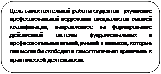 | 1.Организуемая преподавателем самостоятельная работа 2. самостоятельная работа, которую студент организует по своему усмотрению, без непосредственного контроля со стороны преподавателя (подготовка к лекциям, лабораторным и практическим занятиям, зачетам. коллоквиумам и т.п.) | |