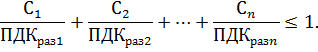 Наибольшая концентрация каждого вредного вещества в приземном слое не должна превышать максимально-разовой предельно допустимой концентрации, т.е. С ≤ ПДКраз. При одновременном присутствии в атмосфере нескольких вредных веществ, обладающих однонаправленным действием, их безразмерная суммарная концентрация должна удовлетворять условию
