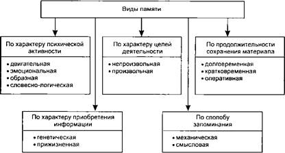 эмоциональную, образную и словесно-логическую; по характеру целей деятельности или критерию произвольности различают непроизвольную и произвольную память; по критерию длительности сохранения материала память подразделяют на кратковременную, долговременную и оперативную; по характеру приобретения информации память делят на генетическую и прижизненную; по способу запоминания различают механическую и смысловую память.