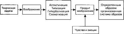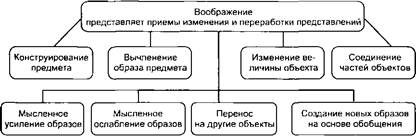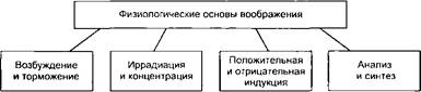 Структуру воображения как писхического феномена можно схематично представить в следующем виде (схема 17). Физиологической основой воображения является сложная аналити- ко-синтетическая деятельность мозга (процессы возбуждения и торможения, иррадиации и концентрации, положительной и отрицательной индукции, анализа и синтеза), в результате которой происходит образование новых систем временных связей на основе ранее сформированных.