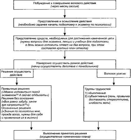 Важную роль наряду с ясностью, осознанностью цели играет и ее доступность, когда человек, используя имеющиеся у него знания, умения, навыки, способности, имеет внутренние условия для достижения конкретной цели. Если цель превышает возможности человека, то он может достичь ее только частично. В том случае, когда цель доступна, но ее трудно достичь, человек ставит ряд промежуточных целей и последовательно борется за их осуществление. Однако при всем значении моментов постановки цели и планирования решающим является выполнение принятого решения. Только при окончательном выполнении человеком действия, доведении дела до конца мы говорим о силе воли и волевых качествах личности. Преодоление значительных трудностей и препятствий свидетельствует о наличии высокого уровня воли у данной личности, характеризует ее целеустремленность, решительность и настойчивость. На схеме 21 представлен пример осуществления волевого действия.