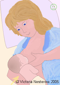 То же самое касается и кормления в положении лежа. Малыш все равно прижимается всем телом к маме. Кликните на картинке, чтобы посмотреть небольшой ролик - на что надо обратить внимание, когда мама и малыш приспосабливаются к кормлению лежа (откроется в новом окне).