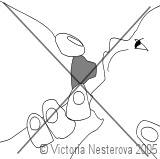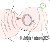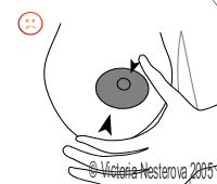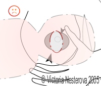Важно: Располагаем пальцы достаточно далеко от ареолы. Как замечает Диана Уэссинджер, «дальше, чем хотелось». Еще дальше. Особенно важно это для указательного и следующих за ним пальцев. Часто их ставят слишком близко к ареоле. Результат — сами ограничиваем ребенку область захвата. Он бы и раскрыл ротик еще шире, да упирается подбородком в мамины пальцы. Так что сантиметров пять, а то и больше, от соска надо отступить. Если грудь небольшая, это может означать, что указательный палец окажется на грудной клетке. Давление большого пальца, который расположен намного ближе к ареоле, приводит к тому, что сосок приподнимается вверх, по направлению к носику ребенка.