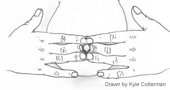 Если ногти мамы достаточно короткие, она может одновременно нажимать на ареолу согнутыми пальцами обеих рук, при этом ее ногтевые пластинки будут почти касаться соска. Цель — создать кольцо из 6-8 маленьких ямок или вмятинок на ареоле вокруг основания соска. Если это делает медик или другой помощник, 2 больших или указательных пальца прижимают к ареоле боком. В результате сверху и снизу от соска появляются вмятинки длиной 2.5-3 см. Но этот метод потребует дополнительные 60 или более секунд давления: пальцы надо будет развернуть на 90º (частично перекрывая первые вмятинки), чтобы обеспечить смягчение такой же области вокруг соска.