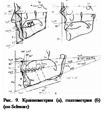 1) краниометрические, 2) гнатометрические, 3) профилометрические, т. е. изучение расположения мягких тканей профиля лица (рис. 9). В качестве ориентира для краниометрии Schwarz предложил использовать плоскость переднего основания черепа (N - Se).