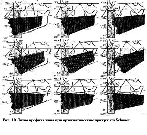 На основании изучения боковых телерентгенограмм лица Schwarz выделил 9 основных типов профиля лица при ортогнатическом прикусе в зависимости от сочетания врожденного положения (позиции) и наклона (инклинации) челюстей по отношению к плоскости основания черепа. В верхнем ряду по горизонтали представлены варианты «прямых» профилей лица (профильный угол Т равен 10°), в среднем ряду - наклоненных, а, следовательно, и «скошенных» кзади (угол Т больше 10°), в нижнем ряду - наклоненных, а, следовательно, и «скошенных» кпереди (угол Т меньше 10°).