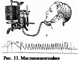 Мастикациография – графический метод регистрации движений нижней челюсти при жевании. Запись, получаемая при этом исследовании, - мастикациограмма - представляет собой ряд волнообразных кривых, отображающих ритм и размах движений нижней челюсти во время жевания (рис. 11).