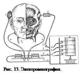 Электромиография – метод регистрирующий биотоки, возникающие в мышцах во время возбуждения (рис. 13). С помощью электронных усилителей эти токи регистрируются в виде "залпов возбуждения", состоящих из типовых потенциалов различной амплитуды.