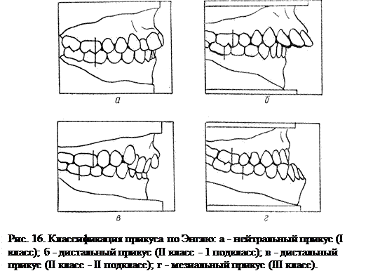 На основании обобщения всего прежнего теоретического и практического материала и своего большого опыта Энгль (Аnglе) в 1889 г. разработал свою известную классификацию аномалий прикуса, основывающуюся на мезио-дистальных соотношениях зубных рядов (рис. 16). Положение зубных рядов определяется соотношением первых постоянных моляров — «ключом окклюзии». По представлению Энгля, верхний первый постоянный моляр должен быть той стабильной точкой, исходя из которой, следует определять все аномалии прикуса или окклюзии (по обозначению Энгля).