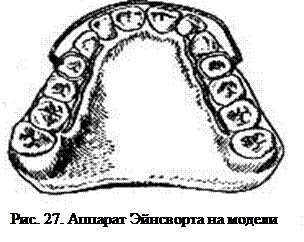 Аппарат Эйнсворта (рис. 27).Аппарат состоит из вестибулярной пружинящей дуги, изготовленной из нержавеющей проволоки диаметром 0,9 – 1,2 мм. Она укрепляется в трубках, вертикально расположенных на вестибулярной поверхности опорных колец или коронок, фиксируемых на премолярах или молярах верхней челюсти. К небной поверхности последних припаяны касательные балочки, прилегающие к пришеечной части зубов, подлежащих смещению.