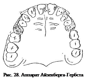 Аппарат Айзенберга – Гербста (рис. 28).Аппарат состоит из коронок или колец, укрепленных на премолярах или молярах, от щечных поверхностей которых отходят горизонтальные балочки длиной 1 – 1,5 см. Свободные концы последних изогнуты в виде крючков, предназначены для укрепления резиновой тяги.