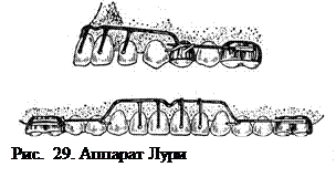 Аппарат Лури (рис. 29).Этот аппарат представляет собой вестибулярную, высоко расположенную над пришеечной частью зубов дугу с отростками.