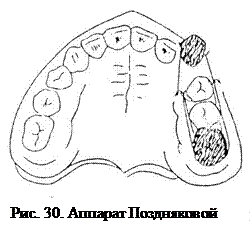 Аппарат Поздняковой для перемещения отдельных зубов (рис. 30).При необходимости переместить клык в дистально-небное положение на первые моляры фиксируют коронку, с обеих сторон которой припаивают касательные, оканчивающиеся крючками, открытыми дистально в области первого премоляра. На клык укрепляется коронка, с обеих сторон которой также припаивают крючки. Между коронками натягивают резиновую тягу.