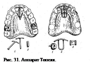 Аппараты Топеля - аппарат для выдвижения верхних фронтальных зубов в губном направлении (рис. 31). Состоит аппарат из съемной пластинки, которая фиксируется в полости рта с помощью коронок на премоляры или моляры. В переднем отделе пластинки по сагиттали вваривают две трубки, в которые входят стержни, имеющие Т-образную форму с припаянной к ним балочкой. В пластинке ближе к шейкам центральных резцов между трубками вварен крючок, открытый мезиально.