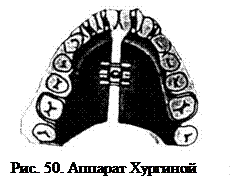 Аппарат Хургиной (рис. 50). Прототипом аппарата является накусочная пластинка Катца. Аппарат представляет собой съемный пластиночный аппарат на верхнюю челюсть с пластиночным базисом и наклонной плоскостью во фронтальном участке, удерживающими кламмерами на 16 и 26, расширяющим винтом и перекидными кламмерами, переброшенными через режущие края верхних резцов.