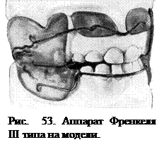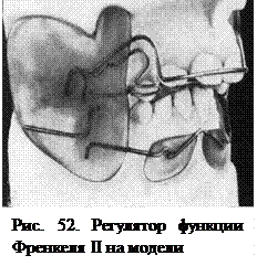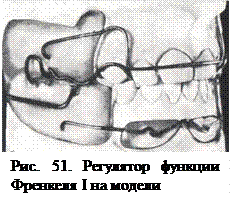 Регулятор функции Френкеля III типа (FR-III) применяется для лечения прогении (рис. 53). Он устраняет тормозящее влияние мягких тканей, окружающих зубные ряды, на рост и развитие верхней челюсти. Его конструктивное отличие от регуляторов других типов состоит в следующем: губные пелоты располагают в области верхней губы, вестибулярную дугу готовят для нижних фронтальных зубов, небную дугу для протрузии верхних передних зубов, окклюзионные накладки на боковые зубы – для разобщения прикуса и задержки роста нижней челюсти.