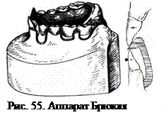 Аппарат Брюкля (рис. 55). Это съемный пластиночный аппарат на нижнюю челюсть, с пластмассовым базисом, удерживающими кламмерами на 36 и 46 зубах, вестибулярной дугой и пластмассовой наклонной плоскостью во фронтальном отделе. Конструктивной особенностью базиса аппарата Брюкля является то, что в боковом участке он плотно прилегает к шейкам зубов, а во фронтальном участке расположен на некотором расстоянии от язычных поверхностей нижних резцов.