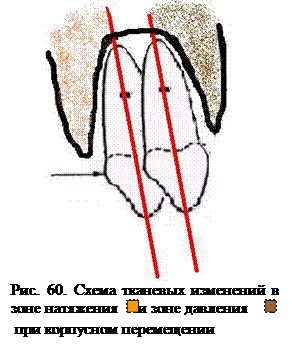 Для корпусного перемещения зубов необходимо использование силы не более 40 – 50 г/см2 (Е.И. Гаврилов, И.М. Оксман, 1968). При действии силы такой величины зубы больше отдаляются от стенки альвеолы, периодонтальная щель расширяется равномерно, и волокна больше натягиваются. В таких условиях раздражение тяги большое, и костеобразование происходит интенсивно остеофитическим образом в направлении натянутых периодонтальных волокон. В условиях действия малой силы, соответственно меньшему натяжению периодонтальных волокон, костеобразование происходит путем напластования.