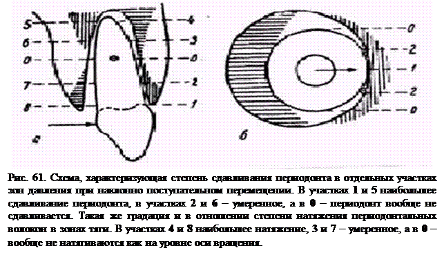 Зуб перемещается наклонно-вращательным образом, вследствие чего он, наклоняясь, в первую очередь соприкасается со стенкой альвеолы в области шейки зуба и на противоположной стороне в области верхушки корня. Если приближаться к середине корня от мест соприкосновения со стенкой альвеолы, то степень сдавливания периодонта постепенно уменьшается.