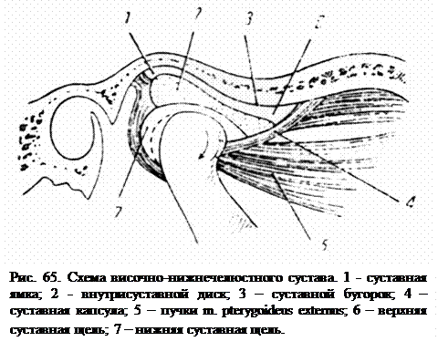Суставной диск является амортизатором при этих сложных движениях нижней челюсти и вместе с суставной сумкой как бы создает искусственную функциональную конгруэнтность элементов сустава. Свод суставной ямки образуется тонкой костной пластинкой, отделяющей сустав от мозговой полости. Такая близость сустава к височной доле мозга и среднему уху создает возможности их травмирования при смещении головок суставных отростков нижней челюсти вглубь суставной ямки, что нередко происходит при разрушении и удалении жевательных зубов.